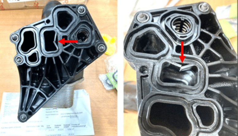 Die Dichtung (beziehungsweise deren Noppen) des Hauptstromölfilters kann einen hohen Druck auf die Buchse ausüben und zu deren Bruch führen.