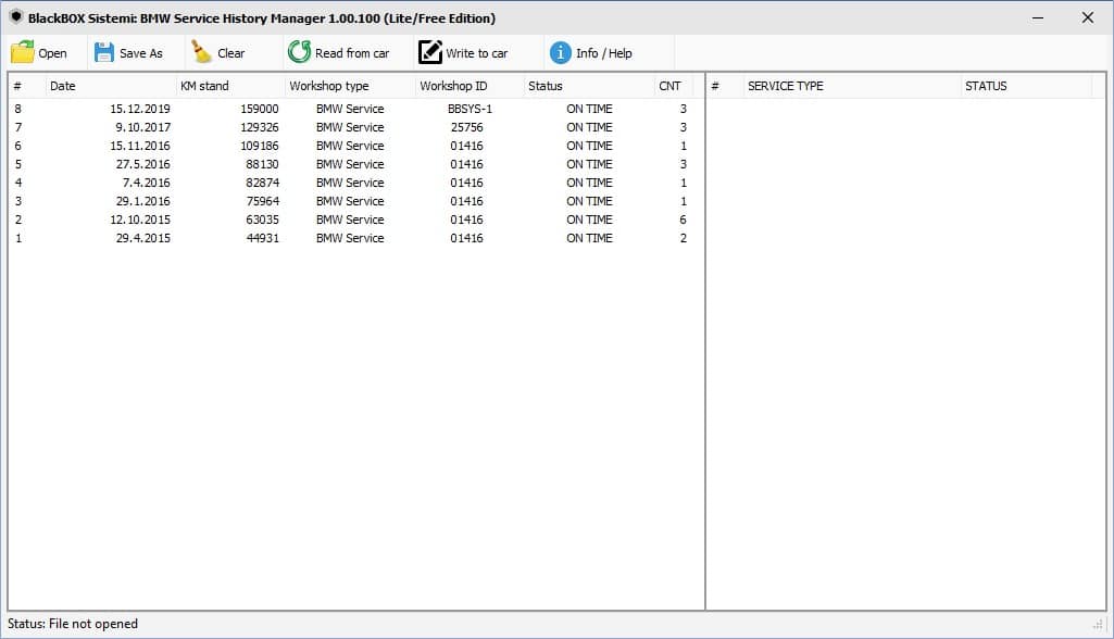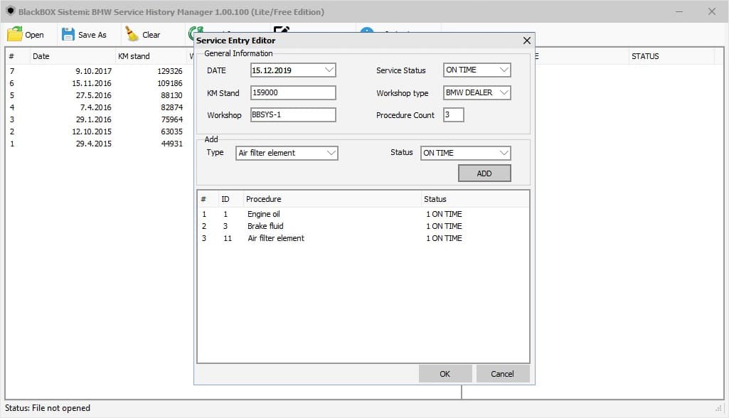 Select the service in the table and change the parameters below: date, milage, dealer, BMW flag, status