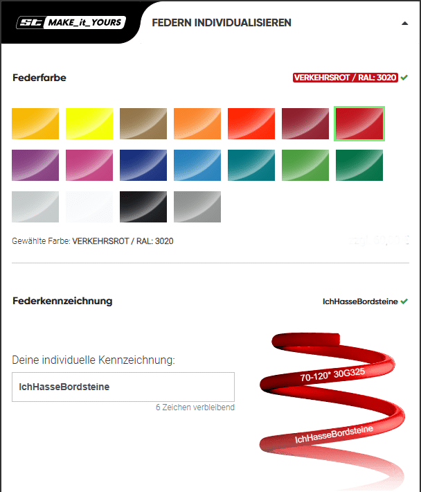 Ihr könnt als Beispiel bei ST-Suspension Eure Federn mit 25 Buchstaben (a-z / A-Z) bedrucken lasse, hier ein paar Inspirationen: