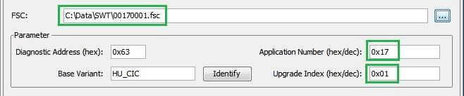 Die Felder “Application number (hex/dec)” und “Upgrade index (hex/dec)” übernehmen automatisch die für die Datei benötigte Werte.