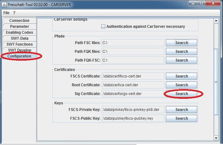 4.Öffne die Seite “Configuration”, drücke die Taste “Search” auf der Höhe “SigCertificate” und öffne die Datei “SIG.der” aus dem bereits entpackten Archiv.