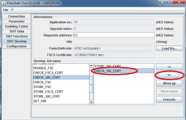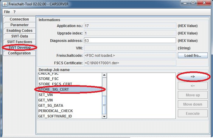 6.Öffne die Seite “SWT Develop”, wähle “STORE_SIG_CERT” und drücke die Taste “=>”. Wiederhole das gleiche mit “CHECK_SIG_CERT”.