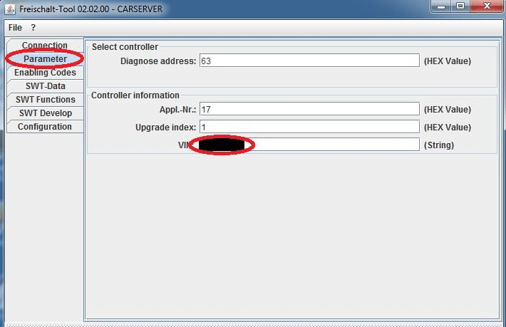 9.Öffne die Seite “Parameter” und gebe die original Fahrgestellnummer des Autos ein.