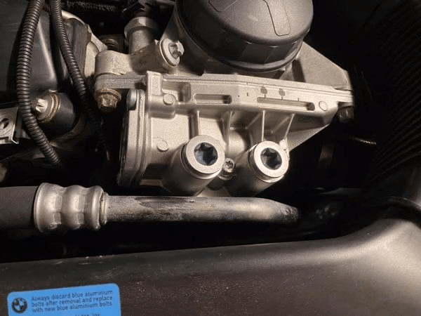 Die Montage ist ganz Regulär wie BMW es vorschreibt. Die zusätzliche Mutter und Beilag Scheiben verwenden um die Ölleitungen an das Thermostat fest zu ziehen, da die Leitungen vom S55 Thermostat von Oben angezogen wird, somit müsst ihr die Leitungen von unten kontern.
